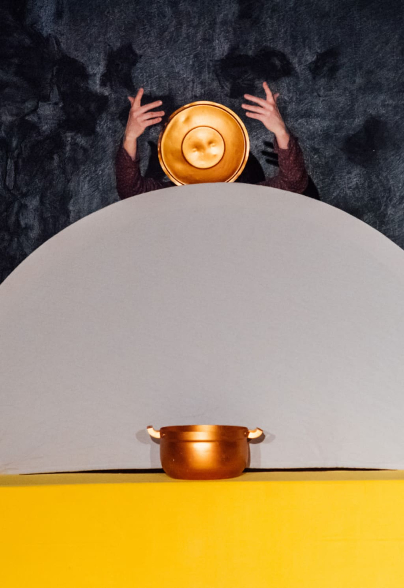Podążając za opowieścią o podróży Słońca po Ziemi, spektakl "Niebiański kucharz" zaprasza dzieci w wieku 1,5-3 lat i ich rodziców do spojrzenia wstecz na wspomnienia o żywym, ale coraz bardziej zapomnianym dziedzictwie naszych starszych. Jak często zdarza się, że młoda mama łapie się za głowę, nie mogąc uspokoić swojego płaczącego cudeńka, lub po prostu całkowicie ucieka, desperacko próbując zająć czymś swoje małe cudeńko, które zdaje się nudzić każdą nową aktywnością w jednej chwili? Twórcy spektaklu obiecują nauczyć najmłodszych widzów i ich rodziców ćwiczeń języka, ćwiczeń logopedycznych i różnych innych starożytnych, autentycznych zabaw, które pomogą im wykonywać codzienne rytuały jedzenia, ubierania się i szykowania do snu z zabawą i, co najważniejsze, praktycznymi korzyściami.